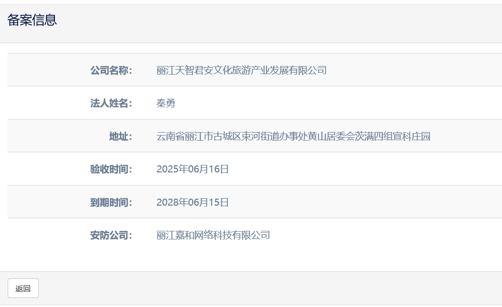 关于丽江天智君安文化旅游产业发展有限公司 电子监控安防合格证下证通知