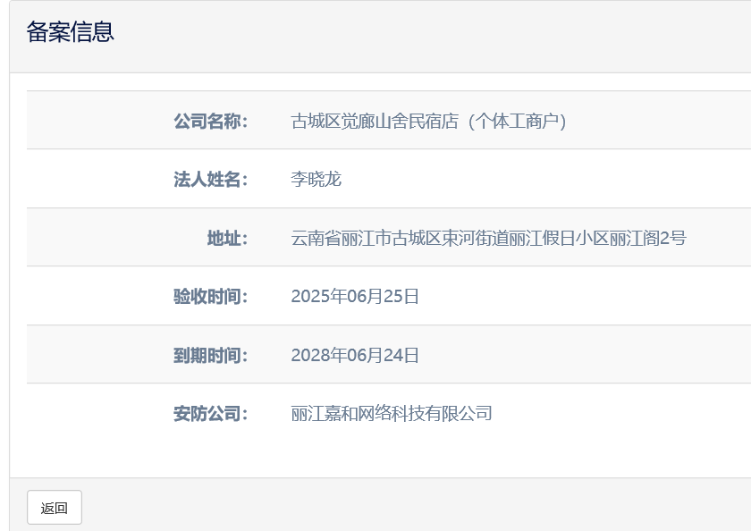 关于古城区觉廊山舍民宿店(个体工商户)电子监控安防合格证下证通知