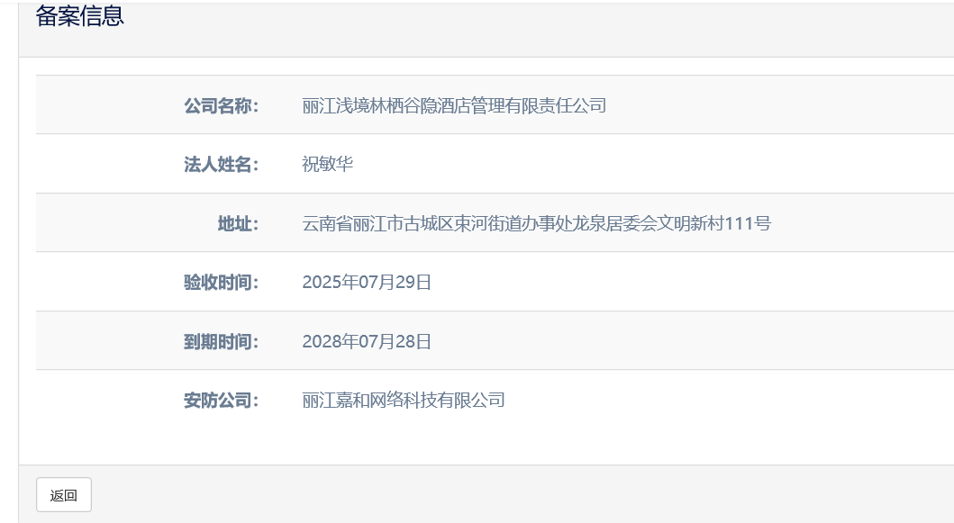 关于丽江浅境林栖谷隐酒店管理有限责任公司电子监控安防合格证下证通知