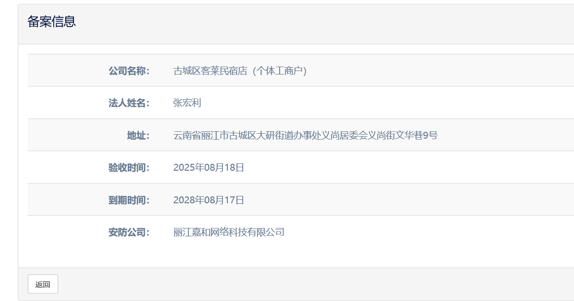 关于古城区麓逸民宿旅店(个体工商户)电子监控安防合格证下证通知