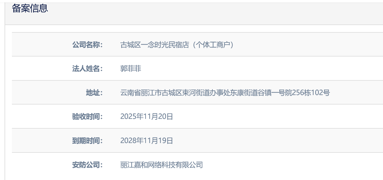 关于古城区一念时光民宿店(个体工商户)电子监控安防合格证下证通知