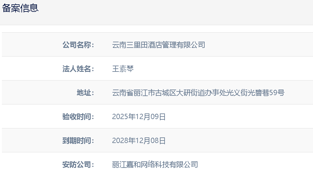 关于云南三里田酒店管理有限公司电子监控安防合格证下证通知