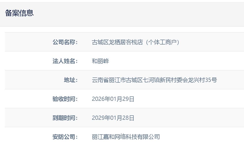 关于丽江市古城区留沁院民宿有限责任公司电子监控安防合格证下证通知