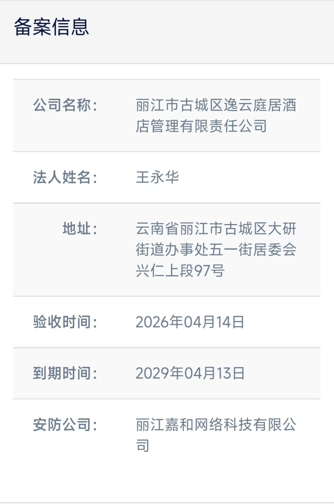 关于丽江市古城区逸云庭居酒店管理有限责任公司电子监控安防合格证下证通知
