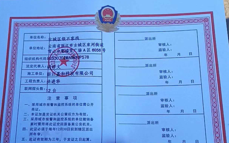 关于古城区麓逸民宿旅店(个体工商户)电子监控安防合格证下证通知