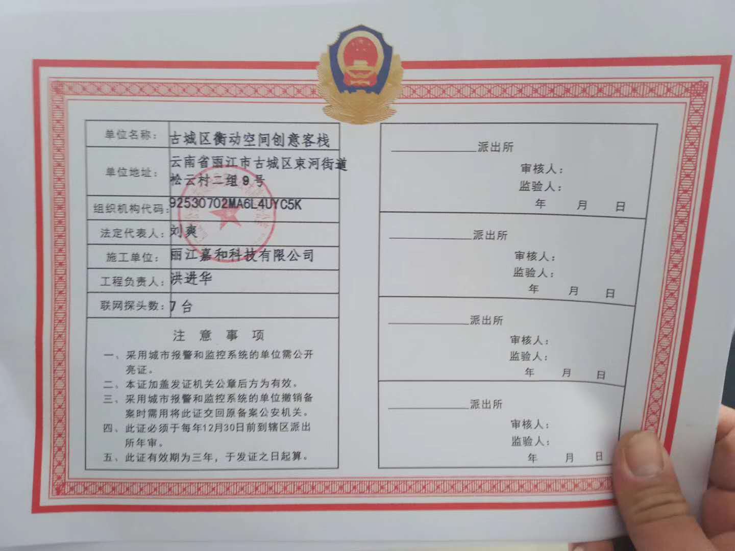 关于古城区麓逸民宿旅店(个体工商户)电子监控安防合格证下证通知