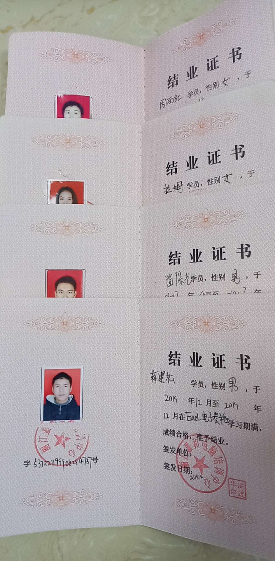 成绩合格。请学员凭身份证来我司领取毕业证书!