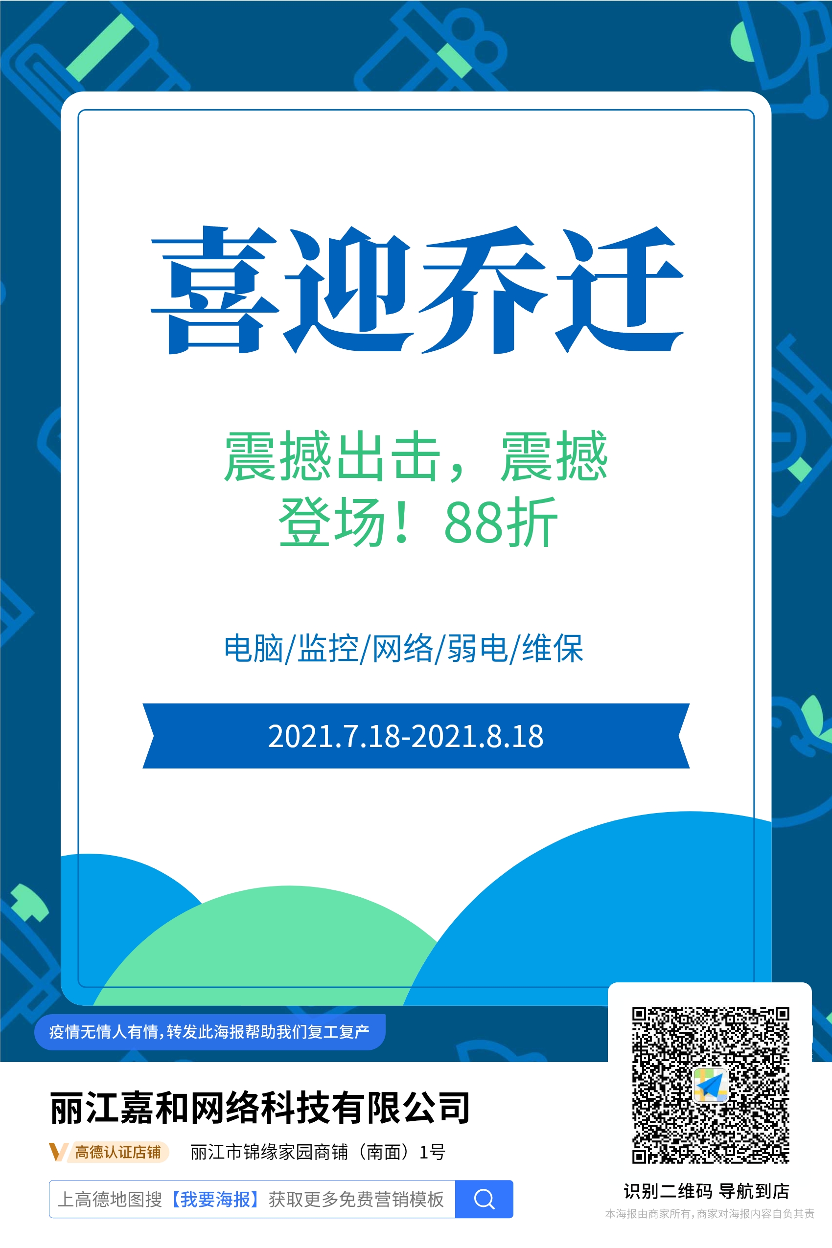 我司因业务发展需要,现公司地址搬迁至丽江市锦缘家园1号商铺嘉和科技公司。有何疑问,欢迎来电。