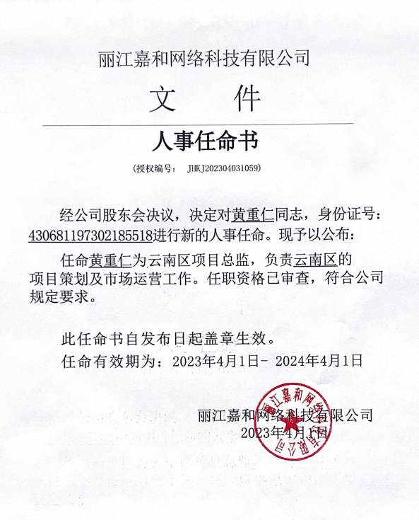 关于任命黄重仁同志为云南区项目总监公告
