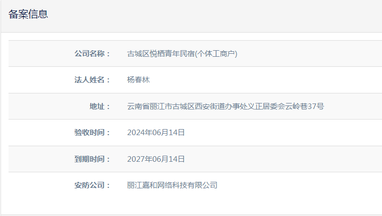 关于古城区悦栖青年民宿(个体工商户)电子监控安防合格证下证通知