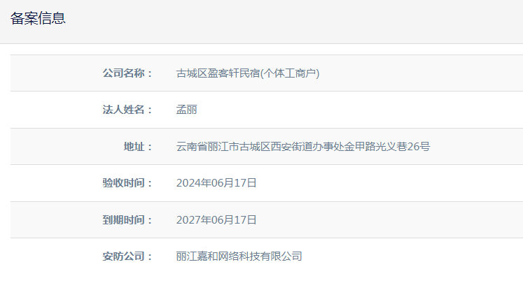 关于古城区盈客轩民宿(个体工商户)电子监控安防合格证下证通知