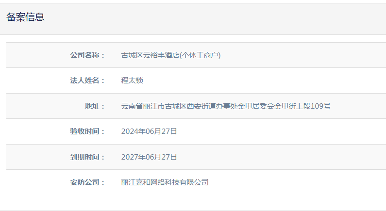 关于古城区云裕丰酒店(个体工商户)电子监控安防合格证下证通知