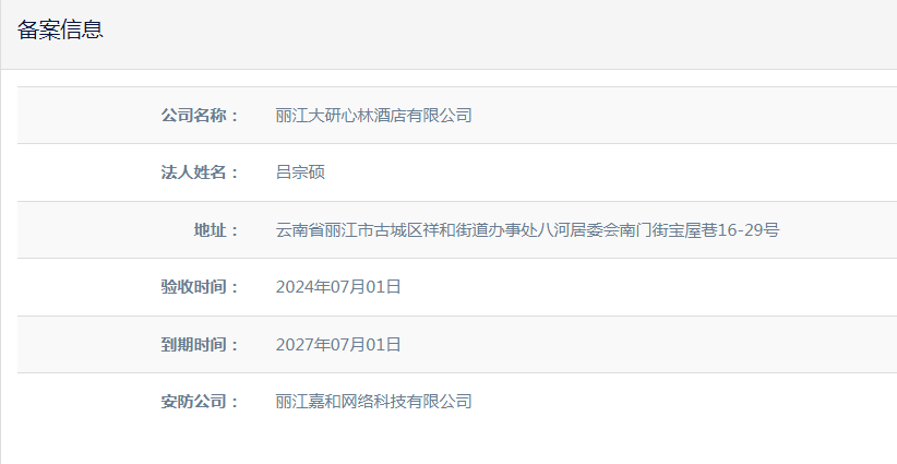 关于丽江大研心林酒店有限公司电子监控安防合格证下证通知
