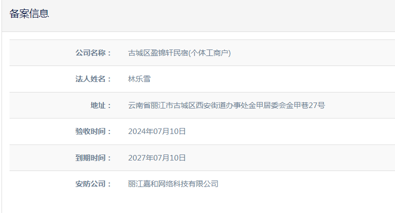 关于古城区盈锦轩民宿(个体工商户)电子监控安防合格证下证通知