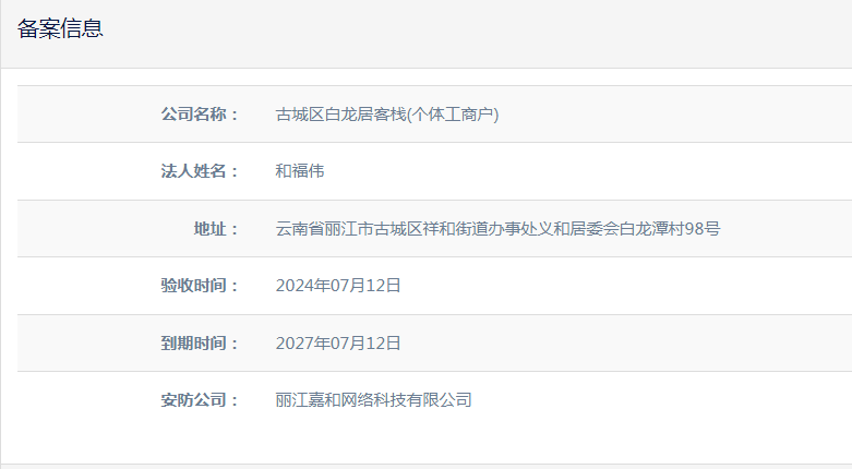 关于古城区白龙居客栈(个体工商户)电子监控安防合格证下证通知