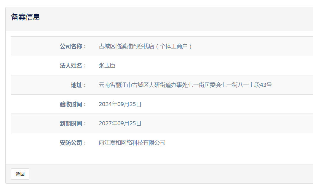 古城区临溪雅阁客栈店(个体工商户)电子监控安防合格证下证通知