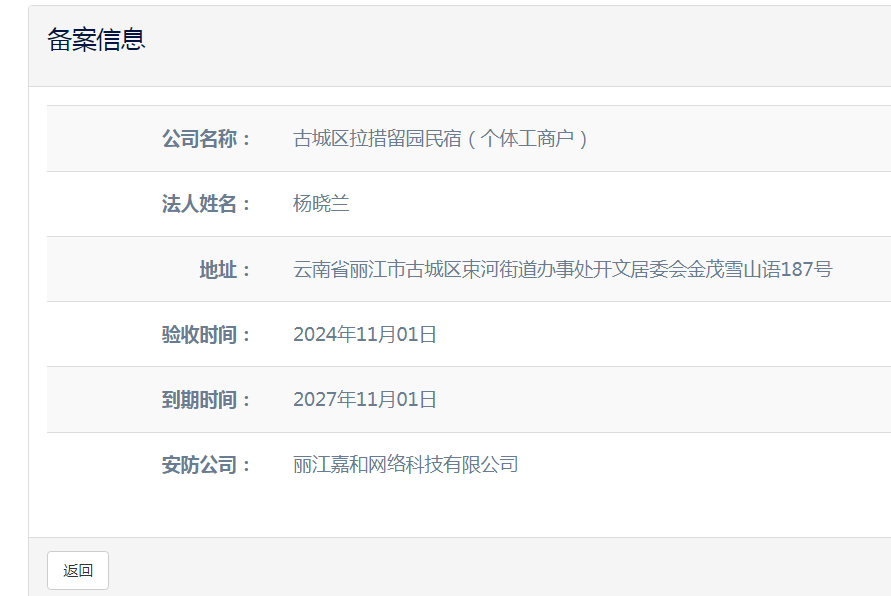 关于古城区拉措留园民宿(个体工商户)电子监控安防合格证下证通知