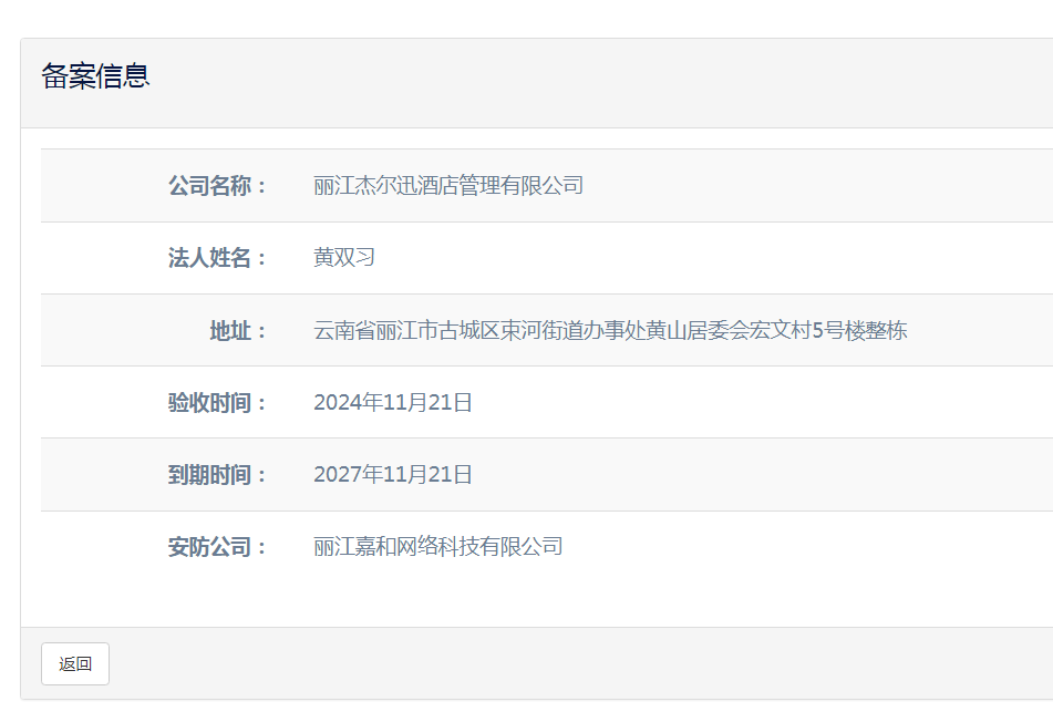 关于丽江杰尔迅酒店管理有限公司电子监控安防合格证下证通知
