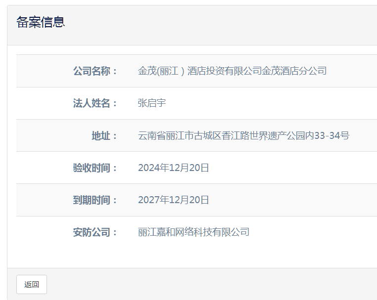 关于金茂(丽江)酒店投资有限公司金茂酒店分公司电子监控安防合格证下证通知