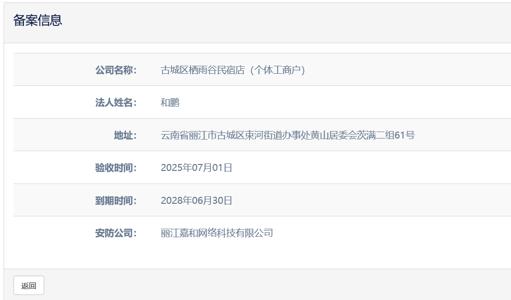 关于古城区栖雨谷民宿店(个体工商户)电子监控安防合格证下证通知