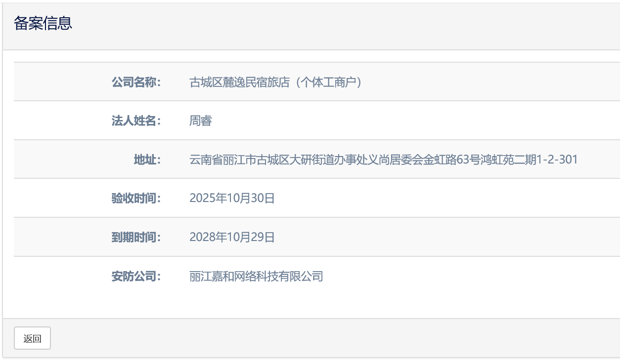 关于古城区麓逸民宿旅店(个体工商户)电子监控安防合格证下证通知