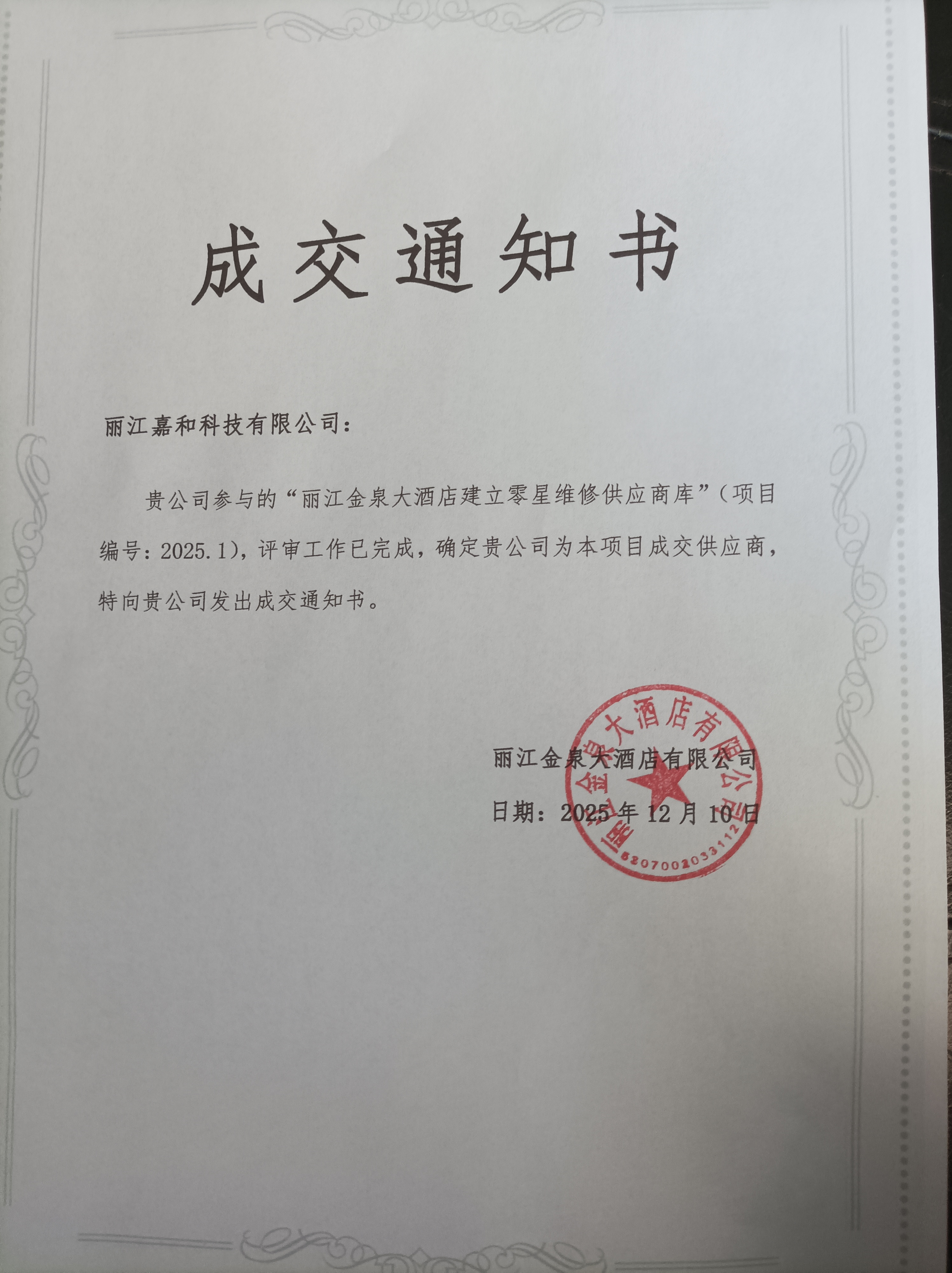 热烈庆祝我司入围丽江金泉大酒店供应商