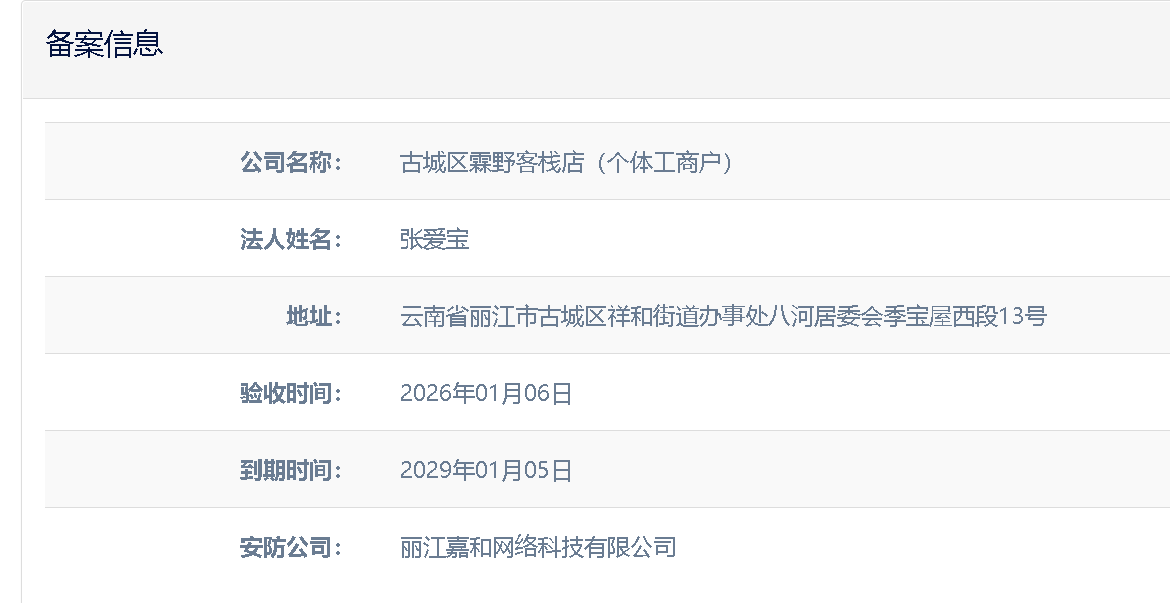 关于丽江市古城区留沁院民宿有限责任公司电子监控安防合格证下证通知